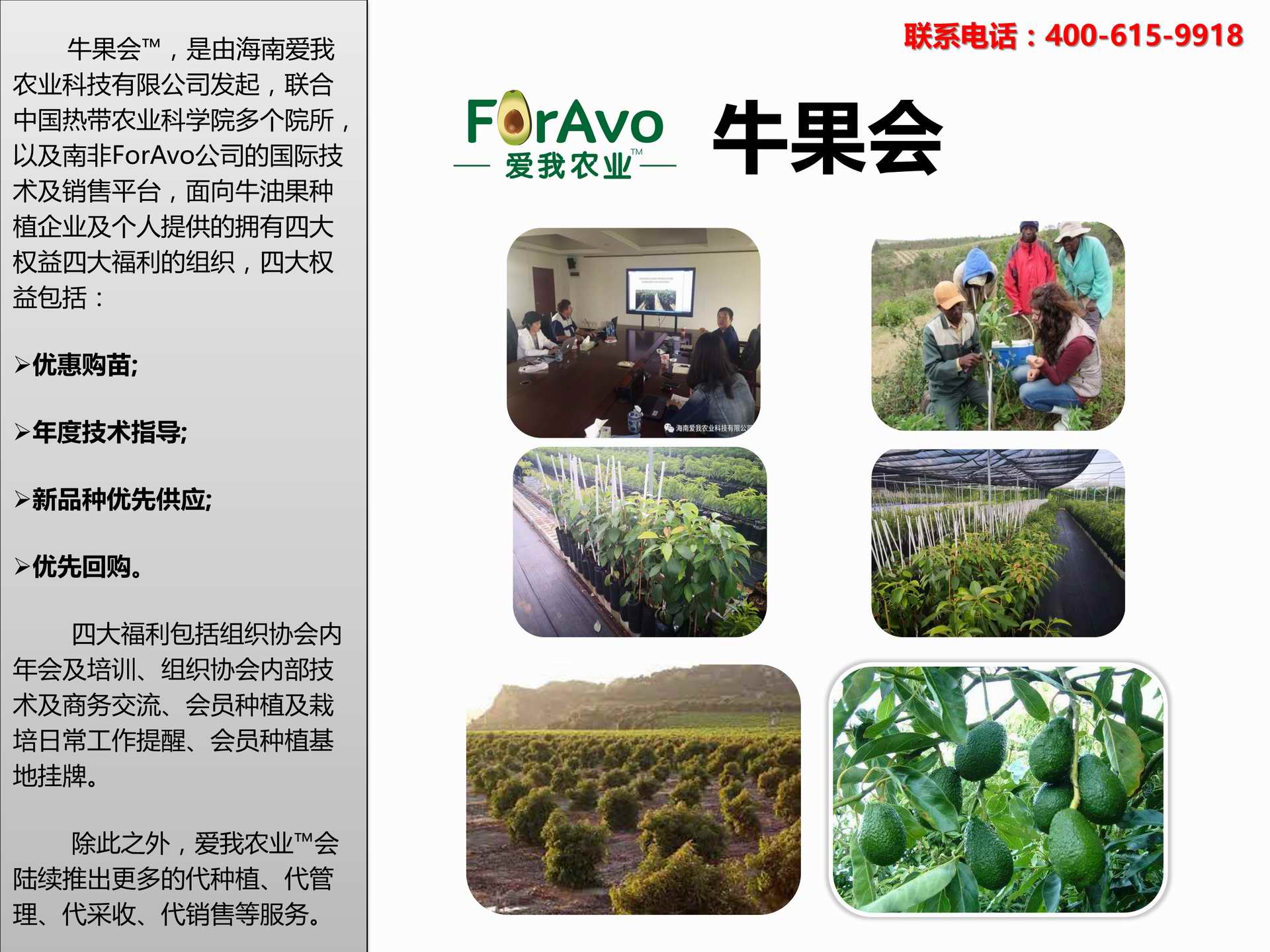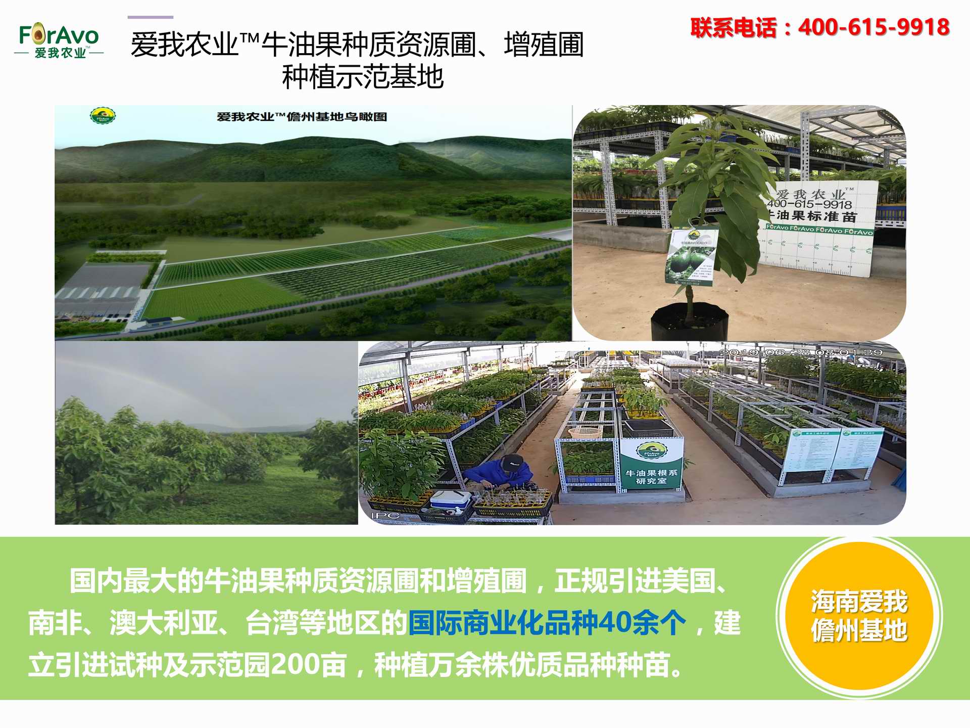 海南愛我農(nóng)業(yè)科技有限公司是一家綜合性的高科技農(nóng)業(yè)發(fā)展企業(yè),旗下愛我農(nóng)業(yè)TM致力于打造中國最大最強的牛油果種植企業(yè)。依托美國、南非、澳大利亞等擁有百年牛油果繁育、種植歷史以及產(chǎn)業(yè)鏈市場的優(yōu)勢,開展牛油果種苗繁育、種植技術,種植加盟、深加工等產(chǎn)業(yè)。結合中國市場,面向廣大苗圃基地、種植農(nóng)場、合作加工等企業(yè),推出的適合規(guī)模化、標準化的牛油果全產(chǎn)業(yè)鏈服務。 Hainan Foravo Agricultural Technology Co., Ltd. is a comprehensive high-tech agricultural development enterprise , dedicated to building the largest and most powerful avocado plantation enterprise in China. Relying on the advantage of avocado nursery, planting history, and the industrial chain over 100 years in the United States, South Africa, Australia, we are carrying out nursery, planting, proce...